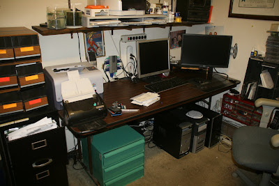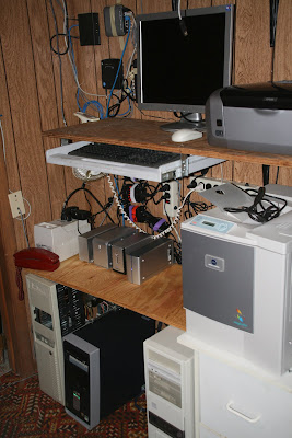 While reorganizing I decided to move the terabyte hard drives onto a computer in the basement, where it's cooler. I had another computer around the house so I erased everything off it and rebuilt it with XP (all the other computers on the network are XP). On that computer I installed the QMS 2300 color laser, an Epson R200 color ink jet (that can print a CD/DVD) and cleaned up the wiring for the cable modem and router.